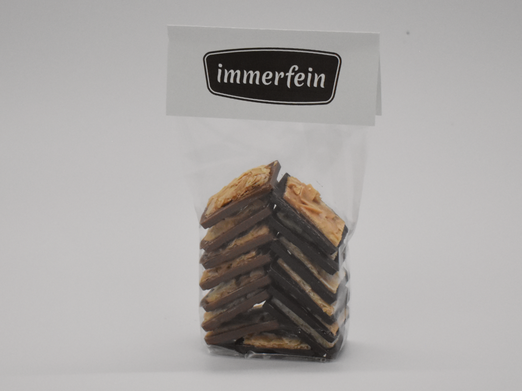 Zucker, Mandeln, Kakaobutter, Kakaomasse, Glukosesirup, Vollmilchpulver, Magermilchpulver, eingesottene Butter, Milchzucker, natürliches Vanillepulver, natürliches Vanille-Aroma, Sojalecithin (E322), Aroma, Gerstenmalzextrak