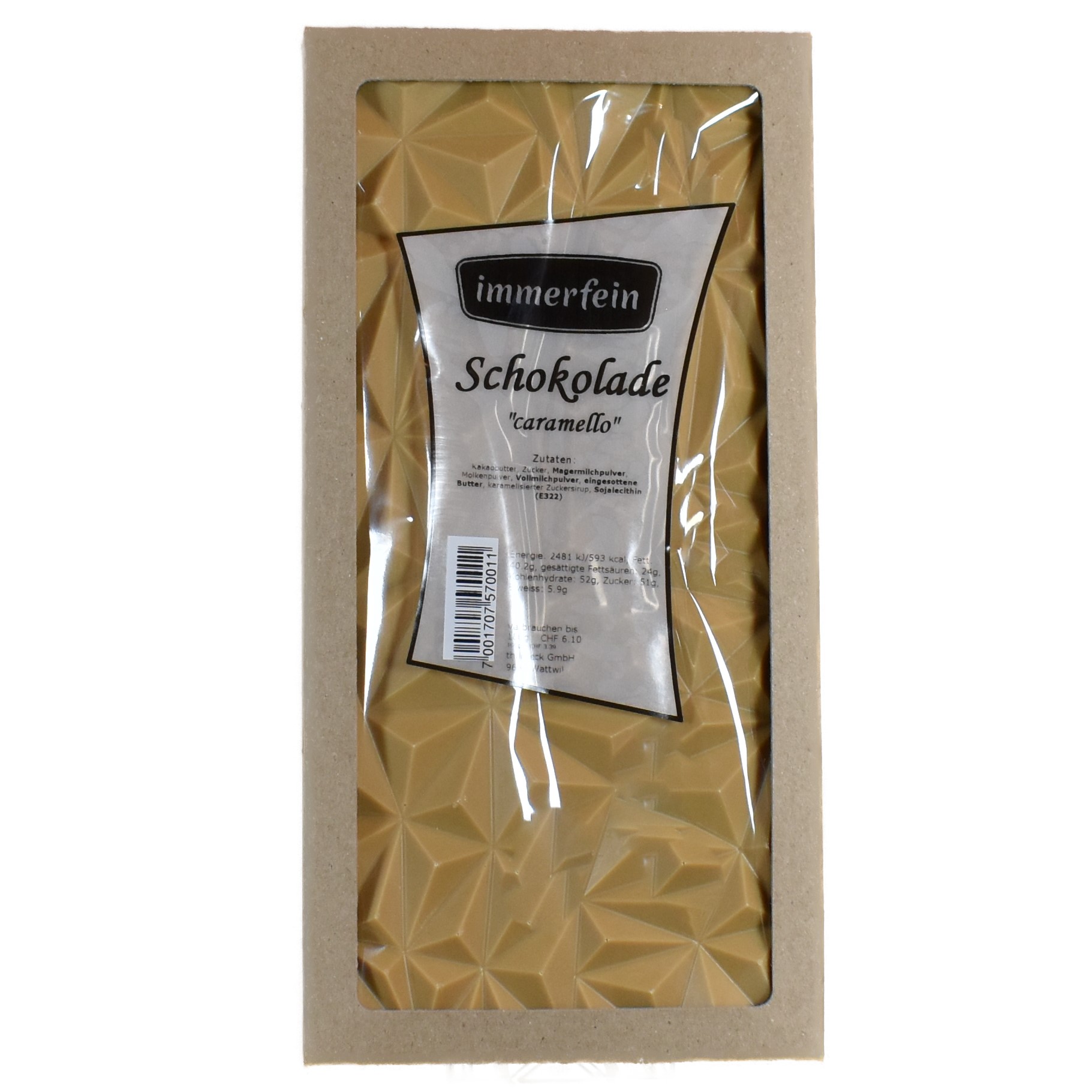 Kakaobutter, Zucker, Magermilchpulver, Molkenpulver, Vollmilchpulver, eingesottene Butter, karamelisierter Zuckersirup, Sojalecithin (E322)